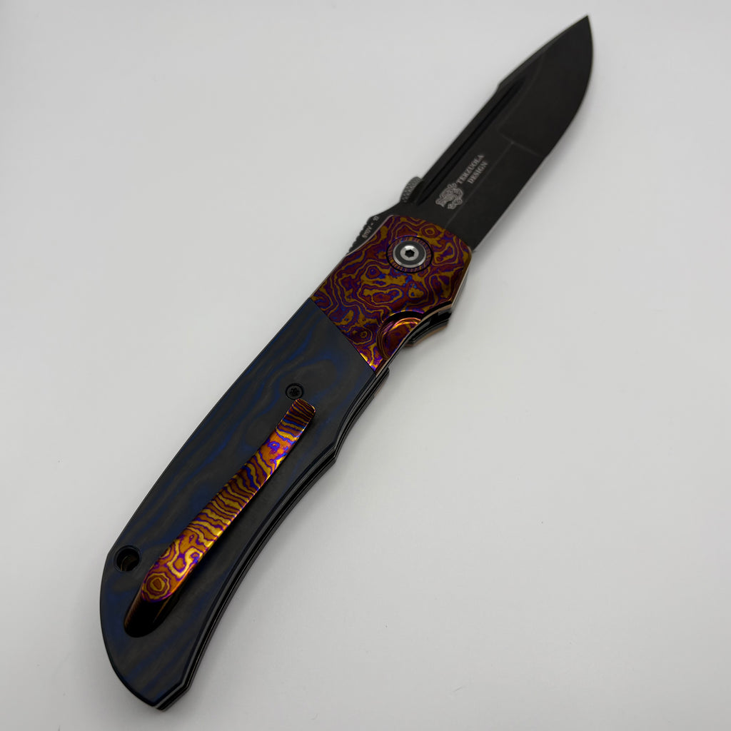 This is a Bob Terzuola design brought to life by Custom Knife Factory! This knife features a MRBS with a CPM-S110V compound ground blackwash blade. It has blue/black carbon fiber scales and timascus bolsters/collars/clip with a carved timascus backspacer. This can be opened with the thumb stud, flipper tab, or with the front flipper.