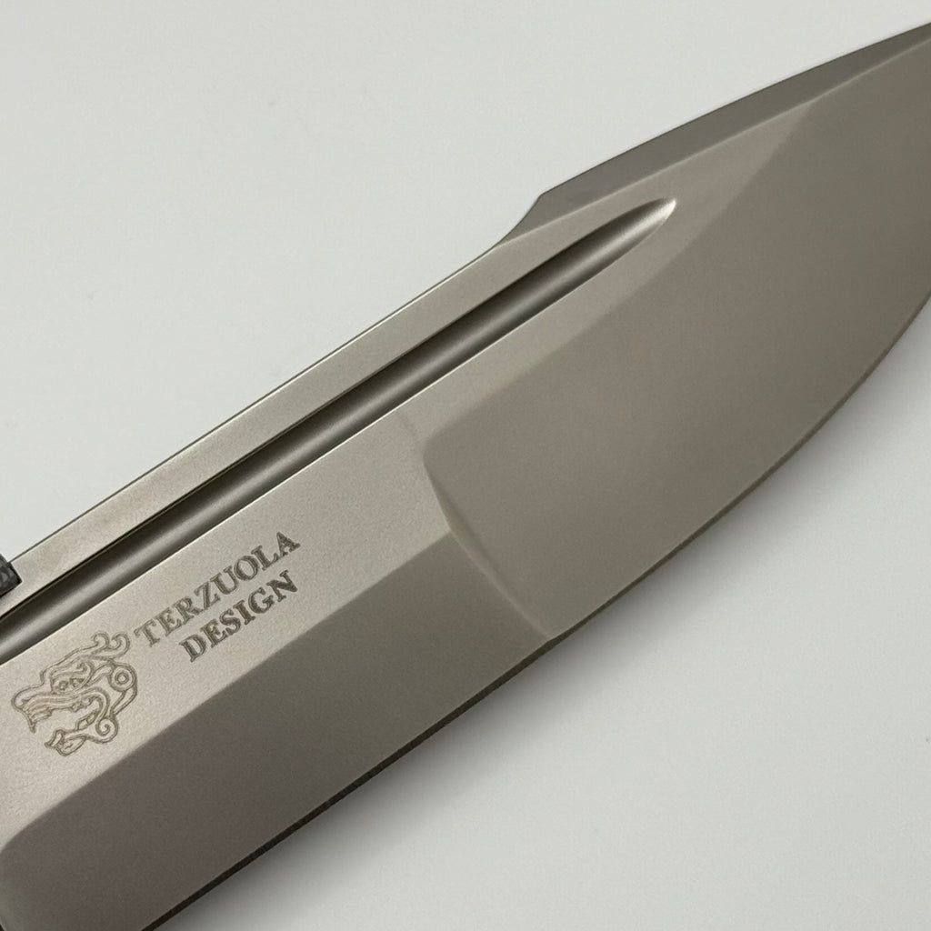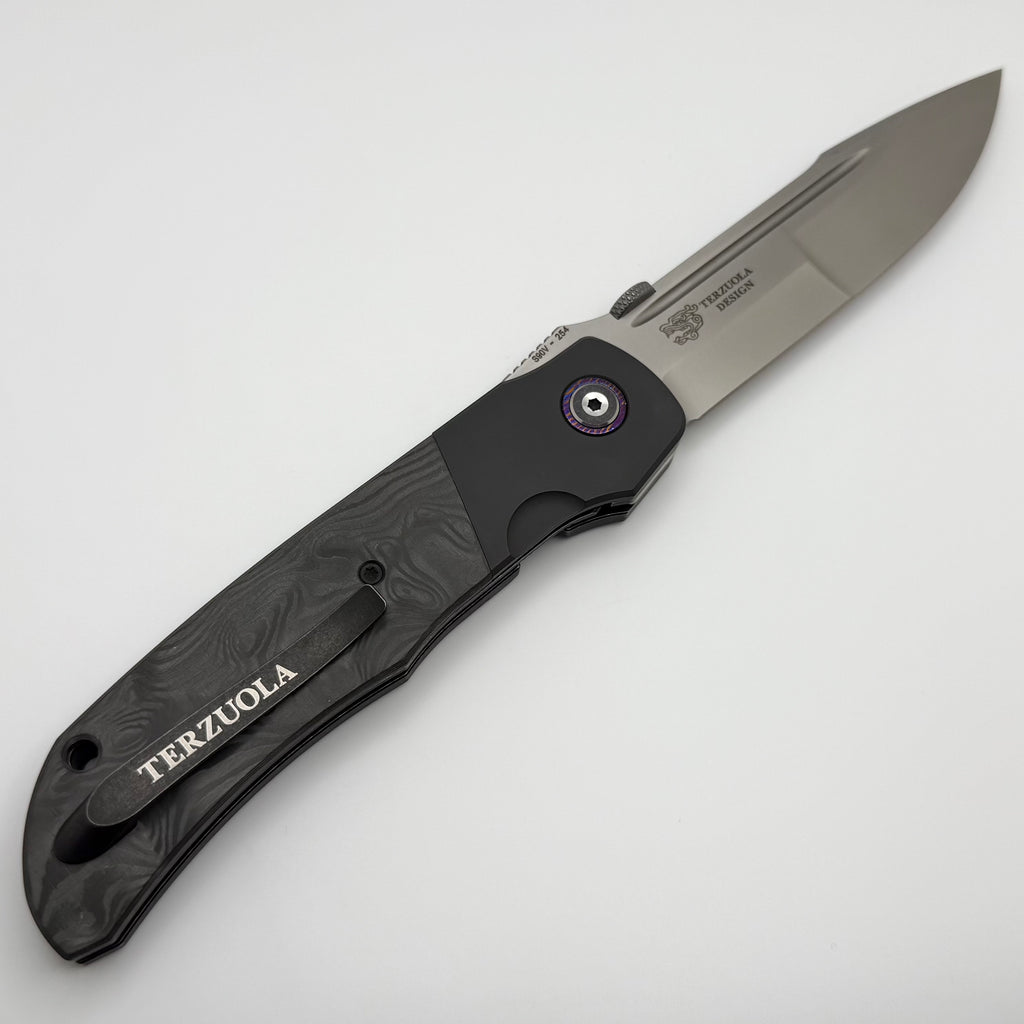 This is a Bob Terzuola design brought to life by Custom Knife Factory! This knife features a MRBS with a CPM-S90V compound ground CKFWASH blade. It has black carbon fiber scales and zirconium bolsters/backspacer with MokuTi pivot collars. This can be opened with the thumb stud, flipper tab, or with the front flipper.