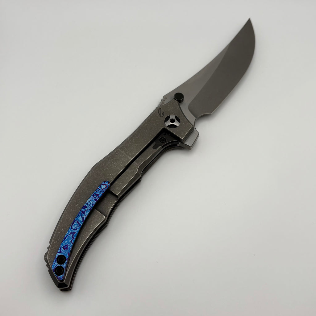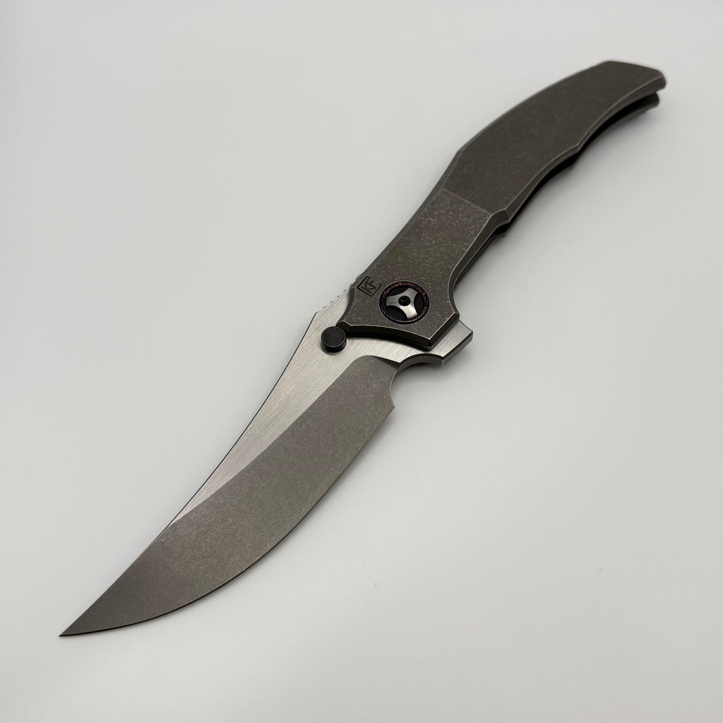 This is the latest collaboration from Custom Knife Factory and custom knife maker Peter Rassenti. This is a production run of Peter's custom Persian folder. This knife features a one piece tumbled titanium integral handle with a timascus pivot collar and pocket clip. It also has a two tone finished M390 upswept Persian blade. The blade sits on bearings and is very smooth. Included in the pouch is an extra set of hardware, bearings, and a bronzed pivot collar.