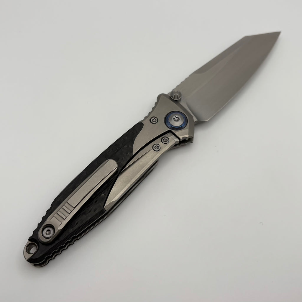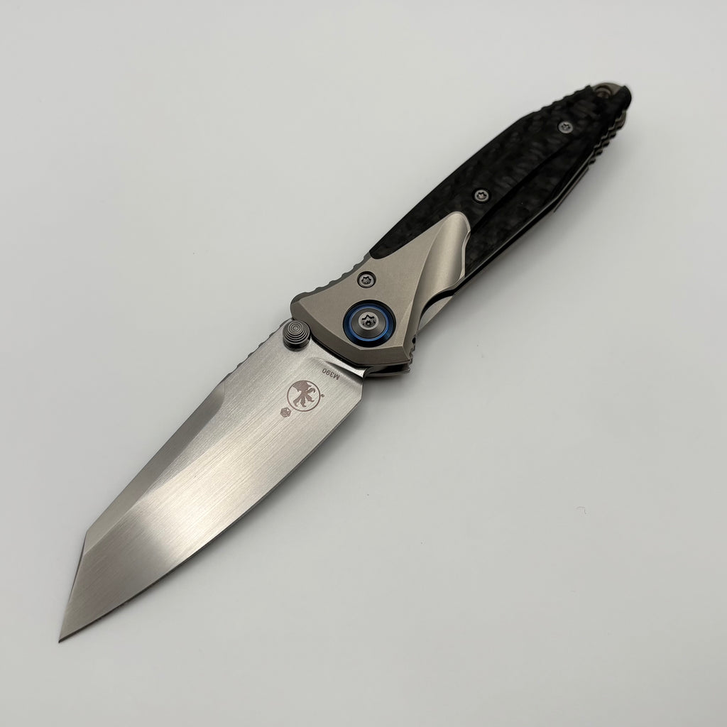 Pre-Owned Discontinued Microtech Knives Socom Bravo Mini Warcom Hand Satin w/ Blue Ti Pivot Collars & Carbon Fiber Scales 263M-4CFTI
