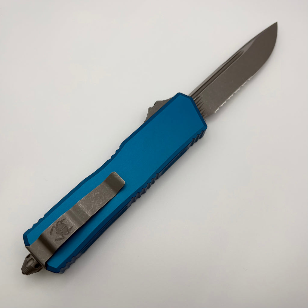 Pre-Owned Microtech Scarab 2 Gen 3 Executive w/ Blue Handles & S/E Part Serrated Apocalyptic M390MK 1176-11APBL