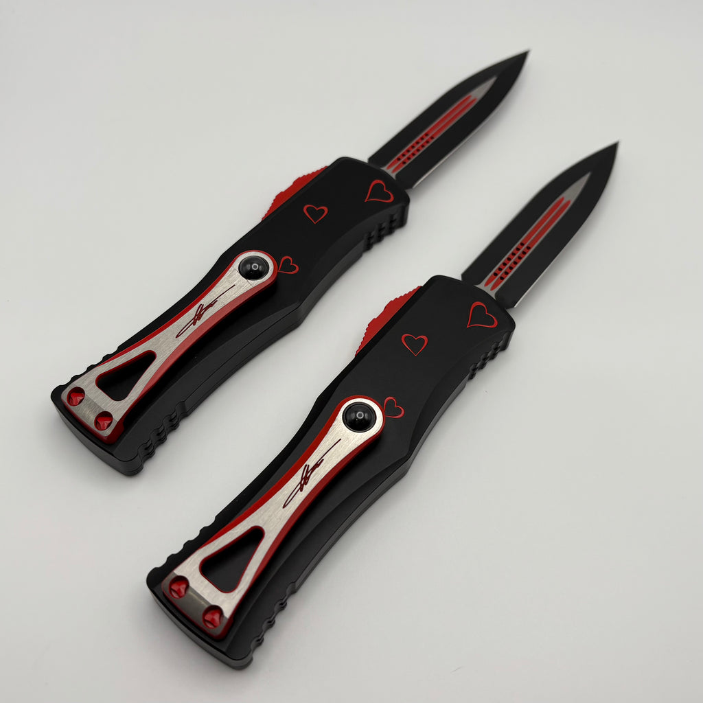 These knives feature deep engraved, hand-embellished red cerakote hearts with a special centerpiece 143 heart. As well as a two toned Double edge M390 blade with red accents and a two toned pocket clip and firing button. These come with a stainless steel heart COA plate and a hand signed box from Anthony Marfione.