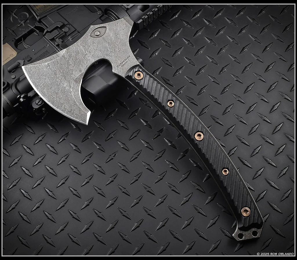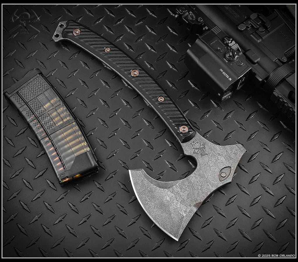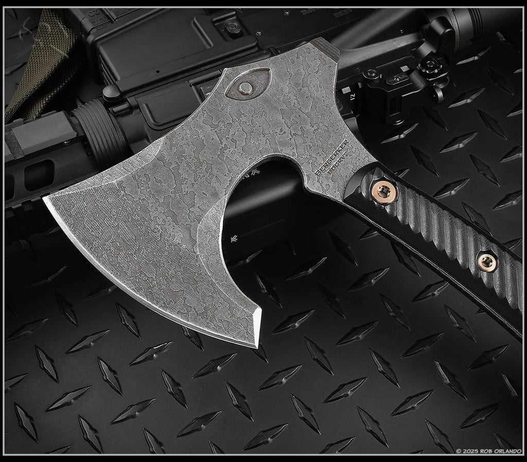 Like so many of the products RMJ designs, The Berserker Blackout was inspired by tradition. In this case, a 9th century Viking wood ax was the inspiration. In addition to the aggressive and distinctive looks, The Berserker is a formidable and functional tool. It features a robust head with nearly 5" of cutting edge, and a curved ergonomic handle that makes this ax a well balanced tool with incredible cutting capability. In addition to the large main edge, the upper and lower forward edges have been sharpened to add more cutting options. The bearded design allows for a high grip for accurate fine motor skill work. The 3D contoured G10 handles incorporate a diagonal, grooved texture for a sure grip without being overly aggressive in feel. The Berserker Blackout features a unique acid etched finish.  Each one will have its own character, no two are the same.  Included is a bottom-eject molded kydex sheath and low-ride M.O.C. straps.