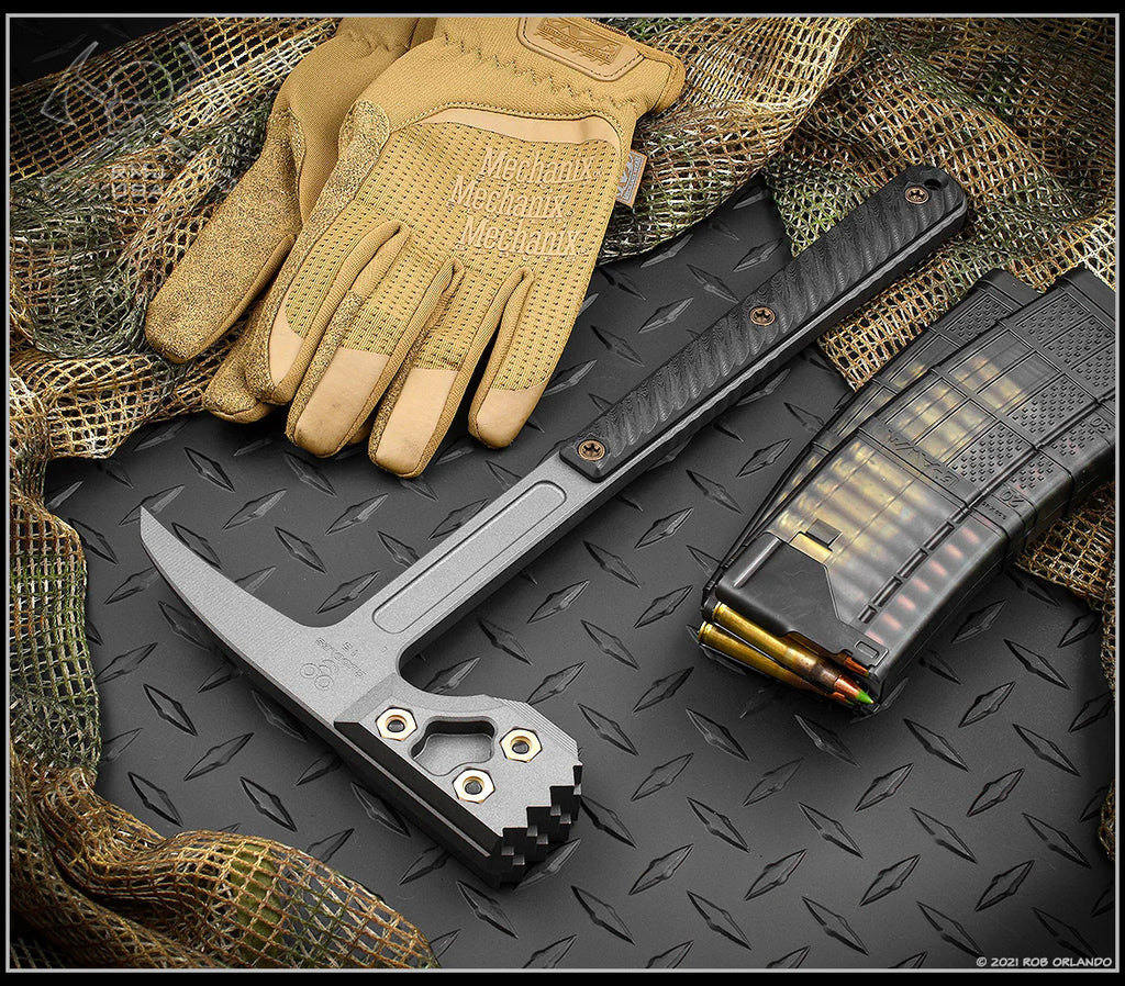 Cuddles is Snuggles little sibling, a more compact hammer that can be can be carried on a belt, pack or shoulder strap due to the smaller size and weight.  It has been proportionately scaled down from Snuggles to maintain the great balance and usability. This is the modern War Hammer / Breaching Tool and closely follows our mantra, one tool, many tasks. Cuddles combines bad ass looks with formidable capability in one package. Designed with a close-quarters battle (CQB) length of 13 1/4" it can be used in tight areas where traditional longer tools may be less effective. It is a tool ideally suited for a patrol car or emergency vehicle, providing a quick action tool for breaching a door or window. The large 8 5/8" head features a meat tenderizer style end with a tapered beard, and the tail end features a 3 1/8" distal taper spike for puncturing.