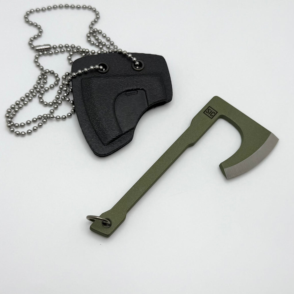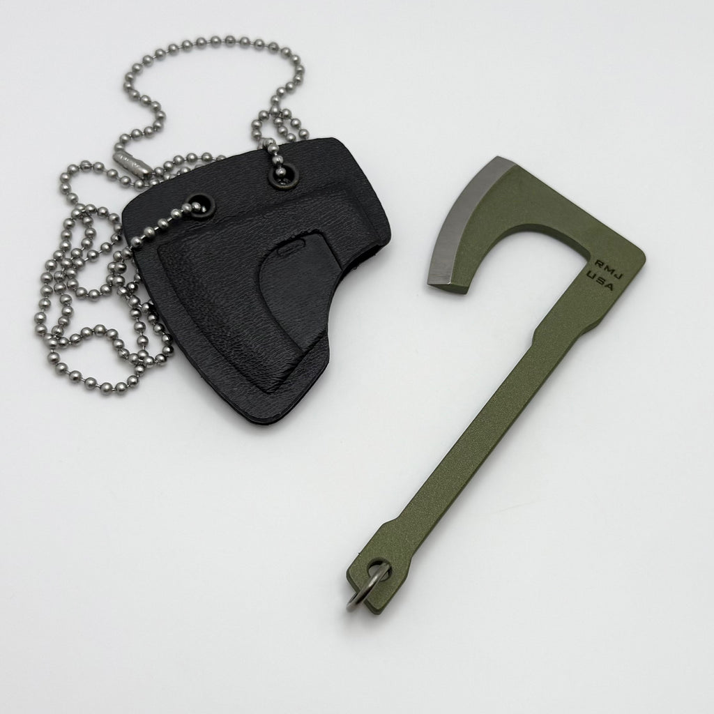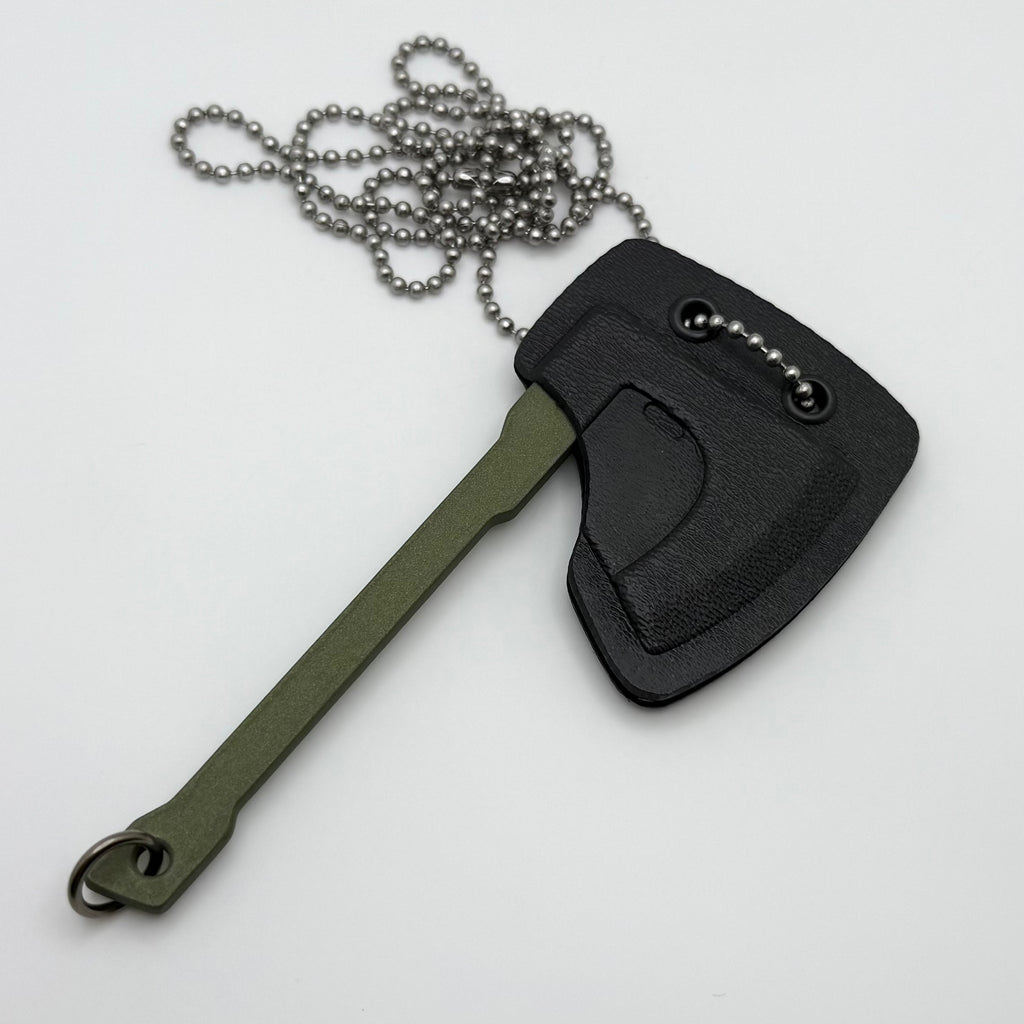The Mortifer Mini Tomahawk is more than just a pendant, it features a live edge that can be used as a small utility knife, great for quick tasks like opening boxes or scoring materials. The Mortifer comes with a Kydex sheath and ball chain so it can be worn as a pendant.  The sheath or the ring through the the handle can be attached to your keys, or a lanyard, etc.