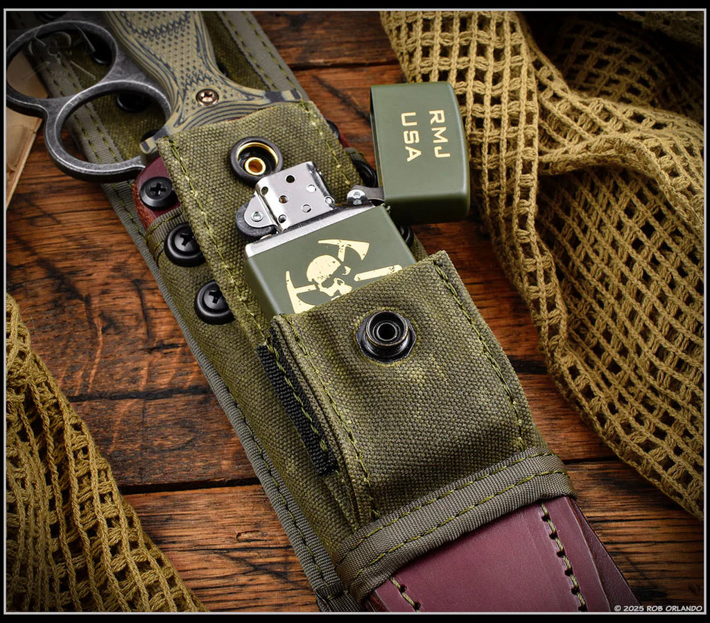 Embodying history and our own design philosophies, the Trench Raider is our rendition of the classic trench knife.  We decided to make something that was more true to size vs the behemoth that is Lady Death.  The Trench Raiders overall length is 11 3/8" overall length, and has a 7 3/16"" CPM-3V double-edge dagger blade featuring a long fuller down the center.  The knuckle duster style handle acts as a guard to protect your hands, and the aggressive outward shape works well for raking.  A small detail regarding the knuckles, the style is patterned after the knuckles that President Lincoln's bodyguard carried. The handle is finished with G10 scales with a checkered texture that is suitable in dry or wet conditions.  The handles are attached with Grade 5 Titanium fasteners that are electro-anodized in bronze to round out the look.  Trench Raider includes a leather and canvas sheath that has a pouch for a lighter mounted on the front.  There is also a lighter included, most look like what is pictured, however there are some easter eggs mixed in.