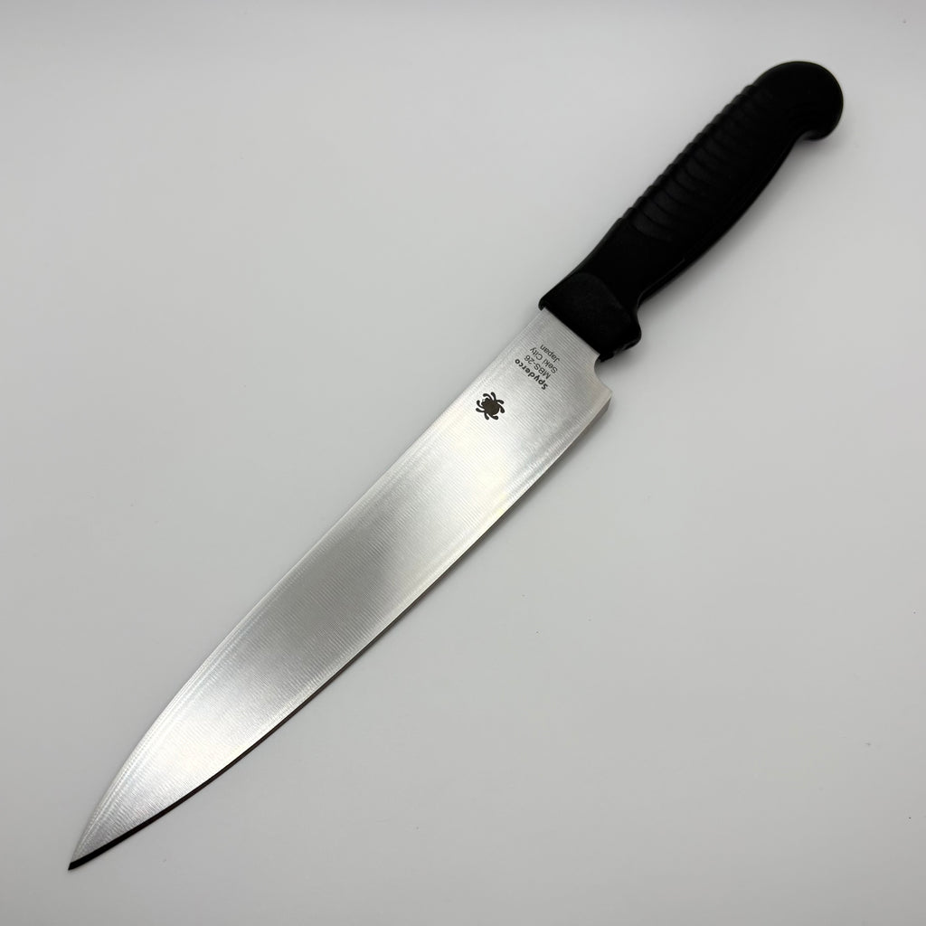 Ideal for a wide range of kitchen cutting chores, Spyderco’s handy 6.5-Inch Utility Knife’s MBS-26 stainless steel blade is ground extremely thin and expertly heat treated for exceptional edge retention. Its durable polypropylene handle is injection molded directly onto the blade’s tang and has a distinctive “stepped” texture pattern for a secure grip. The K04 is available in a PlainEdge™ configuration with a black handle and a SpyderEdge™ format with a choice of black or blue handle. SpyderEdge blades feature a unique two-step serration pattern that protects the edge from dulling on cutting boards.