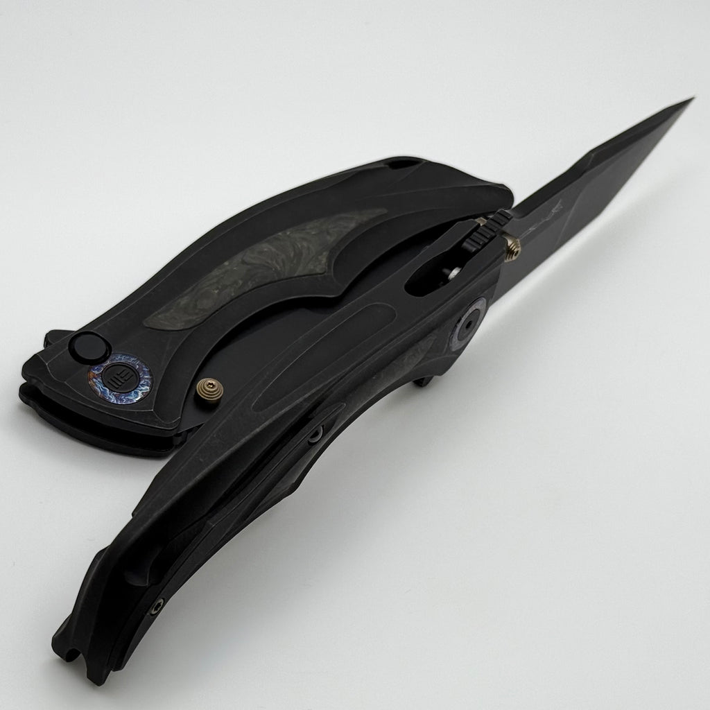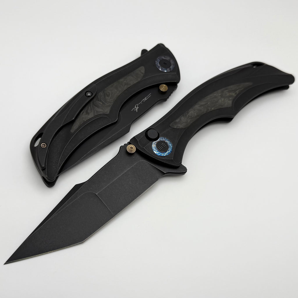 We Knife Tighe Down Black Titanium Integral Handle w/ Yellow Carbon Fiber Inlays & Black Stonewash M390 Tanto WE24054B-1
