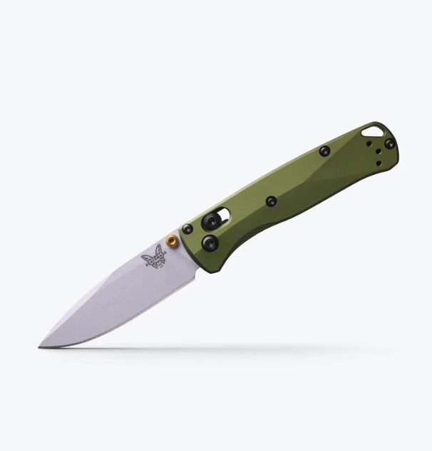 The 533SL-10 Mini Bugout® features earthy, Woodland Green anodized aluminum handle scales, a fresh outdoor hue inspired by the vintage camping gear and cookware you might recognize back at basecamp. With the same slim, ergonomic and compact profile as normal Mini's, we advanced materials beyond the handle, building the 533SL-10 with a premium S90V stainless steel blade with a Crushed Silver Cerakote® finish, and a pop of color, found in its gold anodized thumb stud and barrel spacer.