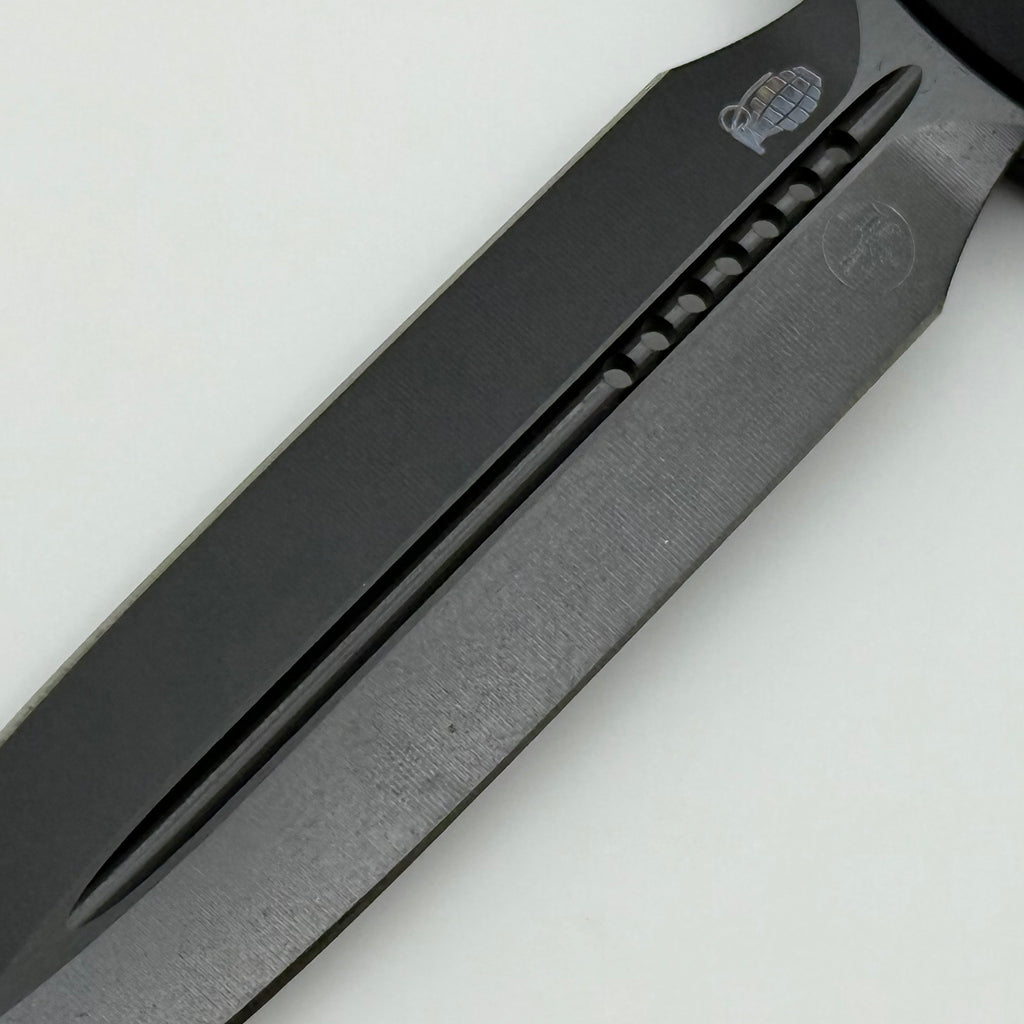 This is a new factory second blem from Microtech denoted by the grenade engraved on the blade.