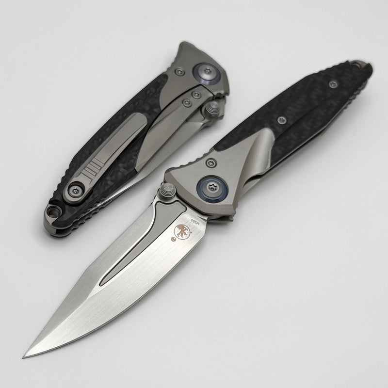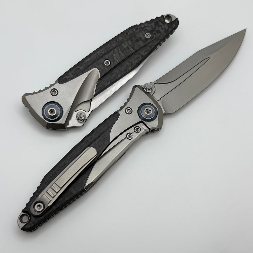 Discontinued Microtech Knives Socom Bravo Mini Spear Point Hand Satin w/ Blue Ti Pivot Collars & Carbon Fiber Scales 262M-4CFTI
