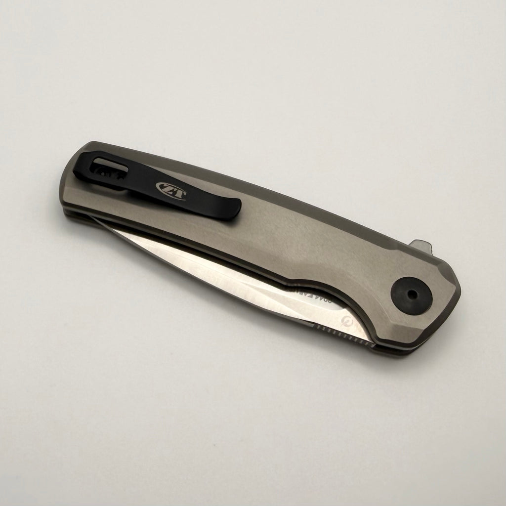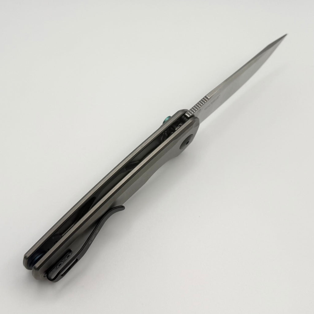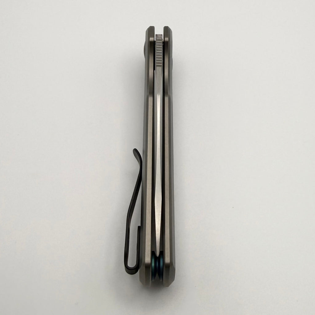 Elevate your gentleman’s carry with the 0044, using its smooth and strong button lock mechanism. Activate the flipper to secure the blade in place. Pressing the steel button releases the blade for buttery drop shut action on ceramic KVT ball bearings. Aside from satisfying fidgeting, the drop point blade works hard using S45VN blade steel for exceptional edge retention and corrosion resistance. Comfortably grip the smooth, weight relieved titanium handle and experience fine details like a teal-anodized titanium button collar, a custom pivot, and a teal-anodized titanium tube spacer. Indeed, the 0044 is worthy of your most premium outings and beyond.